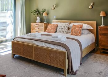Jasmine presents an enchanting getaway as a beautifully oak-built shepherd’s hut. It is furnished with a deluxe double bed, a quaint dining area, and a hand-crafted kitchen, ensuring a perfect balance of rustic charm and modern functionality. The kitchen overlooks the orchard, featuring a small sink, a two-ring halogen hob, a fridge with icebox for those essential ice cubes, and all the necessary equipment for preparing simple holiday meals. To keep cosy there is a charming little wood-burner, complete with all the logs you’ll need for your stay. Adjacent to the hut, guests will find a contemporary and spacious shower cabin, equipped with a double shower cubicle, toilet, wash basin, and a wall-mounted heater, complemented by an array of towels including bathmat, bath towels, hand towels, and flannels, with separate towels provided for pool use.