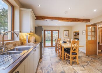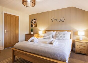 The Fairground Pet Friendly Deluxe Lodge provides the perfect location for families seeking all the fun of the fair, with a few added extras for your fury friends to enjoy. The lodge comes with all the quirky fairground theming and extras such as themed artwork, views of our Big Wheel, Big Wheel planters, and of course, a popcorn machine. Then also comes with some deluxe features for your pets to enjoy. We’ve got a private fenced garden area, outdoor pet cleaning & rinsing area, and (our personal favourite) your doggo’s own lodge kennel. We’ve got a whole host of extras inside the lodge too, from a doggy goodie bag, to dog beds, to dog bowls – we’ve gone barking mad! Like the Fairground Lodge, it has three bedrooms and sleeps up to six people. The master bedroom offers guests a king-size bed and en suite shower room, whilst the two twin bedrooms each provide two full size single beds for the little ones or even the grandparents. The family bathroom includes a full-size bath with overhead shower. An open-plan living area with vaulted ceilings creates an inviting, airy space whilst floor to ceiling windows provide plenty of light. A fully equipped country-style kitchen with shaker style units and an island breakfast bar, along with dining table with six chairs completes the communal space. Walk from your lounge through French doors onto the private decking space complete with hot tub and casual outdoor seating (not available in the winter months), perfect for relaxing after a busy day exploring Folly Farm or visiting Pembrokeshire’s spectacular beaches and countryside! Pets allowed.
