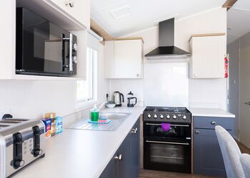 Lookout Lodge is a luxurious 3-bedroom lodge (sleeps 6) it boasts a centre lounge entrance. This large holiday home, gives the whole family plenty of room to relax and unwind and enjoy endless views of the harbour. The Lodge welcomes you with an open plan, living kitchen and dining area, all beautifully decorated with modern designs. The living room has large comfortable sofas for you to sit back and relax whilst watching the smart TV. The kitchen is equipped with everything that you would need including fridge, freezer, dishwasher, washing machine and microwave. To the right of the lodge are the two single bedrooms, one which offers a large bunk bed with twin beds and both rooms offering luxury mattresses. There is also a large family bathroom with bath and shower. To the left of the lodge is the master suite, the extra-large bed also boasts a luxury mattress to ensure that you have a wonderful nights sleeps. The master suite also has it’s own full size views of the harbour as well as the open-plan living area which opens out to the private decking where you can relax on the outdoor furniture and enjoy endless views of the harbour. Added extras include free Wi-Fi and towels. Private parking for one car is included, extra parking is available throughout the park charges apply. Pets are not accepted in this accommodation.Images are representative and may not be the specific accommodation assigned on booking.