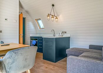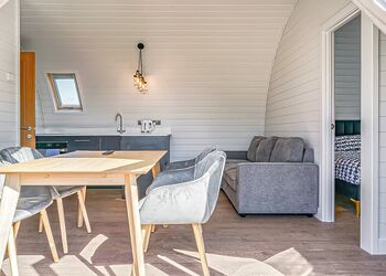 The Superb Elite Pod is a sleeps 4, fully self contained pod, ideal for couples. With contemporary design and fantastic modern features, this Open-planned home away from home has a comfy sofa, wall-mounted Smart TV, fitted kitchen with all the amenities and utilities required to rustle up a nice meal, a comfortable double bed and a studio pull out bed. The bathroom consists of a walk-in shower, sink and toilet.Images are representative and may not be the specific accommodation assigned on booking.