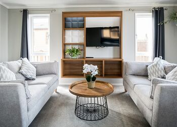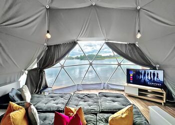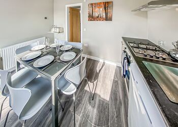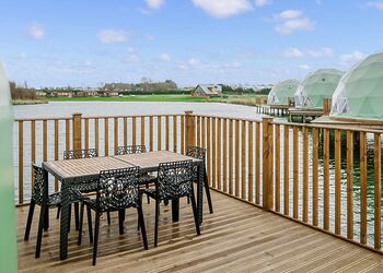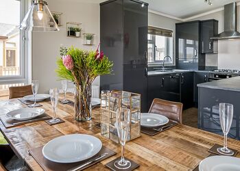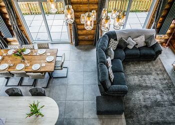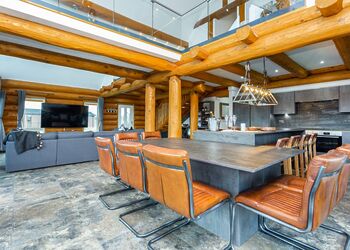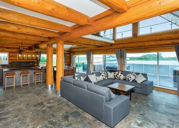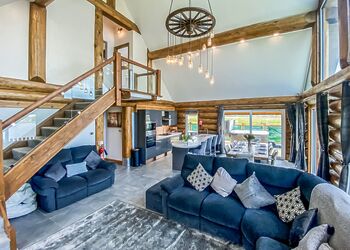 This luxury log dream home is quite simply stunning, imported from a bespoke log cabin manufacturer in the beautiful snowy mountains of British Columbia. Each log is carefully handcrafted from top quality Western Red Cedar wood then beautifully assembled to construct this spectacular log home. Our in-house design team have added their special touches to make this cabin breath-taking from the moment that you step through the door and contains everything that you could possibly need for your perfect cabin retreat in the country.The ‘Greywolfe’ is the largest of three log cabins at Ream Hills, sleeping up to 16 guests. The Greywolfe has 8 x super king en suite bedrooms, and is situated on the water’s edge, boasting stunningly beautiful views of our spring-fed lake. Watching the sun set from the decking of this lodge is truly breath-taking. Or even better yet, soak up the views whilst relaxing in one of two bubbling hot tubs!The luxurious interior has been thoughtfully created and filled with all the home comforts you would require to enjoy your perfect holiday. Accentuating the beauty of this cabin is an open plan kitchen, dining and living space. Natter with friends and pop open the prosecco whilst sat at the kitchen island, the Greywolfe lends itself to a social dining space! Snuggle up on the large U-shaped sofa with your favourite film on a 82" flatscreen Smart TV (subscription for apps required). The perfect cosy space to play board games with the family, kickback and forget the world! This spectacular cabin also has a relaxing seating area located on the first floor with an L-shaped sofa and lounge chairs, a special place to cosy up and take in the stunning views across the water and farmlands beyond.Offering eight luxurious en suite bedrooms (shower and W/C), all of which include super king-size beds, four of which are zip and link - which provides the advantage to turn two upstairs and two downstairs rooms into twin bedrooms, should you require. All bedrooms also have Smart TVs.The beauty of the first floor bedrooms is that each have a balcony with outdoor seating, enjoy the sunrise whilst sipping on your morning coffee…the best way to start your day in our opinion!The kitchen is inclusive of bar seating, large double fridge, freezer, microwave, two ovens, a large induction hob and a dishwasher with cleaning starter pack (dishwasher tablets, washing up liquid, dish cloth, tea towel and spare bin bags). There is also a wine storage area with wine cooler. Additionally, there is a washer/dryer under the kitchen counter if you happen to require these facilities during your stay.The lodge has private gated access and a private driveway with ample parking.Please note: There is a £500 security deposit.Images are representative and may not be the specific accommodation assigned on booking.