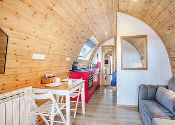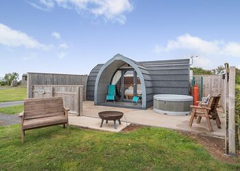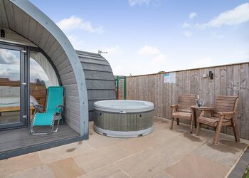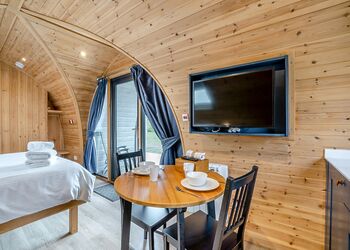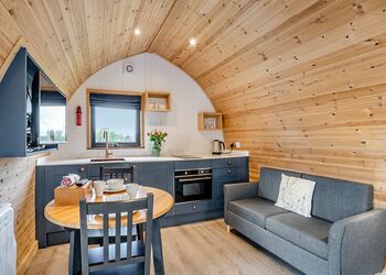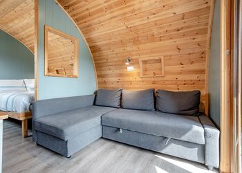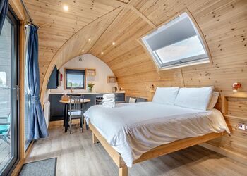 The Rugby is a stylish, spacious pod, offering stunning views of the Cleveland Hills, with accommodation for two people in sleeping area with a king-size bed. The large outside area comprises of a covered seating area, accessed from the French doors, accommodating a seating area plus an additional paved area which is furnished with a timber seating and includes a fire pit (logs are available to purchase on site).
