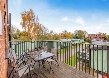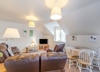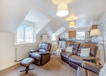 Stylish and contemporary first floor apartment. Master double with en suite shower and two twin. Bathroom. Towels included. open-plan living area. Dishwasher. Lift and stairs access. Suitable for parties including visitors with partial disabilities – please check when booking. No pets.