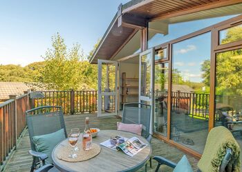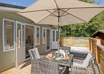 Luxurious and bespoke lodge, ideal for a family or a couple’s retreat. One double bed with en suite shower, and one twin bedroom. Shared bathroom with shower over bath. Spacious open plan lounge/kitchen/dining area with breakfast bar and French doors leading to wrap around deck with raised outdoor hot tub and outdoor furniture enjoying a woodland setting. On-site parking. No pets. ...